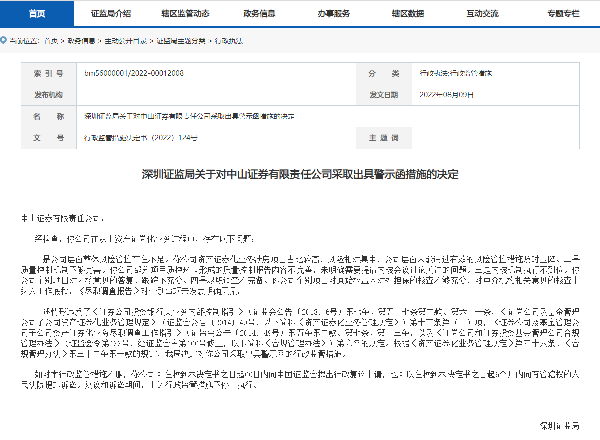 深圳证监局通报指出,中山证券在从事资产证券化业务过程中,存在以下问题: