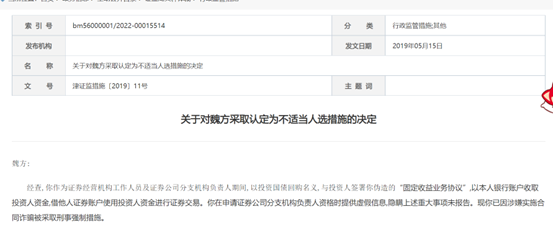 天津证监局指出,魏方在申请证券公司分支机构负责人资格时提供虚假信息,隐瞒上述重大事项未报告。现因涉嫌实施合同诈骗被采取刑事强制措施,因此将其认定为不适当人选。不过,该行政监管措施尽管2022年10月24日才挂网,发文日期却是2019年5月15日,整整隔了三年之久。有资料显示,魏方上述推荐“国债回购”固定收益产品自上个世纪90年代末就以开始。并约定年化收益率,按照投资金额的高低从15%至25%不等。后来,因资不抵债,魏方无法偿还投资人本息,于2018年10月份向公安相关投案自首。