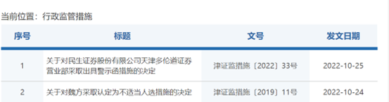 10月25日,天津证监局向民生证券天津多伦道证券营业部(原民生证券天津福安大街证券营业部)下发警示函。