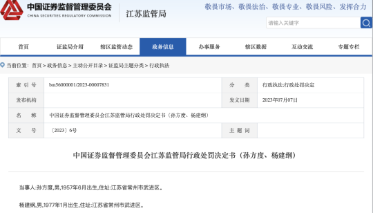 最后,江苏证监局表示,对于孙方度和杨建纲罚款、没收的数额认定准确,且已充分考虑其配合调查等因素,综合考虑违法行为的事实、性质、情节和社会危害程度,对其处以行政罚款的幅度适当。对其提出的免于处罚或减轻处罚的陈述、申辩意见及提交的证据不予采纳。