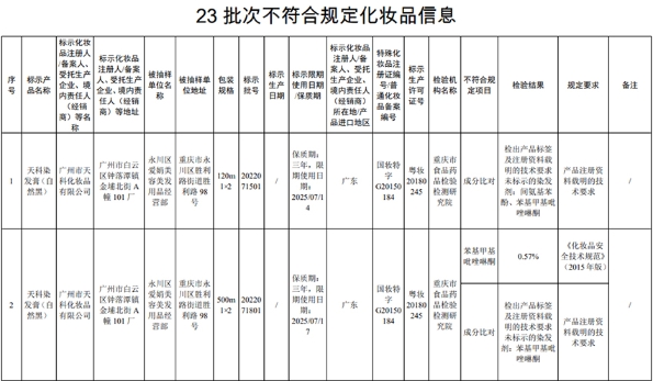 国家药监局近日发布通告,在2023年国家化妆品抽样检验工作中,经重庆市食品药品检验检测研究院等单位检验,产品标签标示为广州市天科化妆品有限公司生产的天科染发膏(自然黑)等23批次化妆品不符合规定。