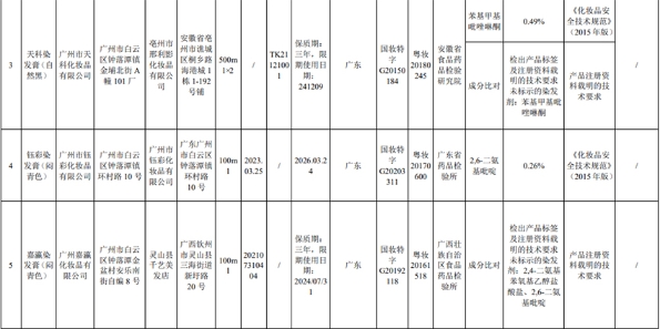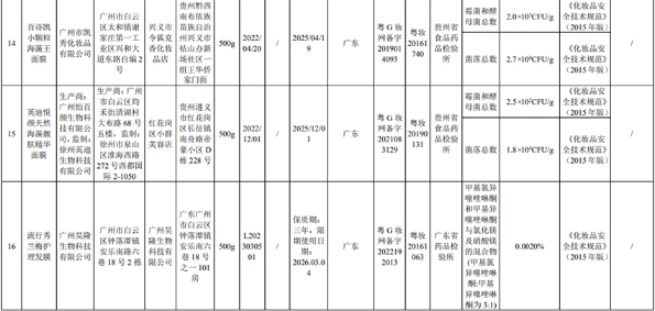 通告显示,本次不符合规定的23批次化妆品涉及广州市天科化妆品有限公司、广州市钰彩化妆品有限公司、广州嘉瀛化妆品有限公司、广州市白云区雅顿化妆品厂、广州有孚精细化工有限公司、广州雅升生物科技有限公司等,包括染发膏、防晒乳、面膜、保湿霜等产品。