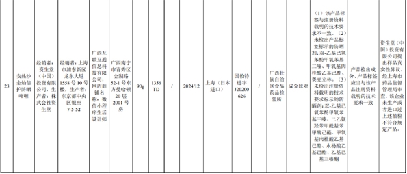记者注意到,其中,产品标签标示为欧莱雅(中国)有限公司生产的兰蔻轻透水漾防晒乳(标示批号:78W200)“未检出产品标签及注册资料载明的技术要求标示的防晒剂”;产品标签标示为朋友(上海)化妆品销售有限公司进口的普柔玛丝特染发膏(配合普蓉斯绨双氧乳)(标示批号:7X15)“检出产品标签及注册资料载明的技术要求未标示的染发剂”;产品标签标示为资生堂(中国)投资有限公司经销的安热沙金灿倍护防晒啫喱(标示批号:1356TD)“产品标签与注册资料载明的技术要求不一致”、“未检出产品标签标示的防晒剂”、“未检出注册资料载明的技术要求标示的防晒剂”。