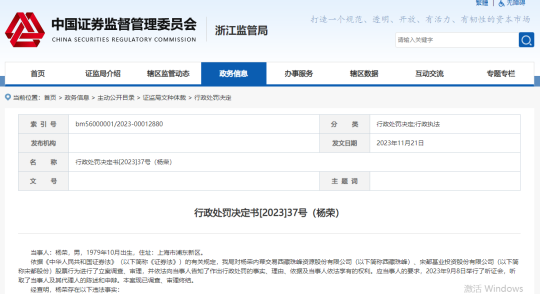近日因内幕交易“西藏珠峰”“宋都股份”的股票,启迪清源(上海)新材料科技有限公司(以下简称启迪清源)执行董事杨荣被浙江证监局开出罚单,被没收违法所得3528.27万元,并被处以3528.27万元罚款,罚没款合计达7056.54万元。