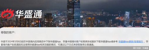 3月8日,华盛证券宣布,自当日起在中国境内应用商店下架华盛通App。华盛证券表示,此次调整不影响存量境内客户继续使用华盛通App。存量境内客户仍可通过华盛通App进行交易,相关服务和业务均不受影响。此外,公告还指出,未来华盛证券将继续服务好所有存量境内客户,为存量境内客户提供优质产品、服务及客户体验。