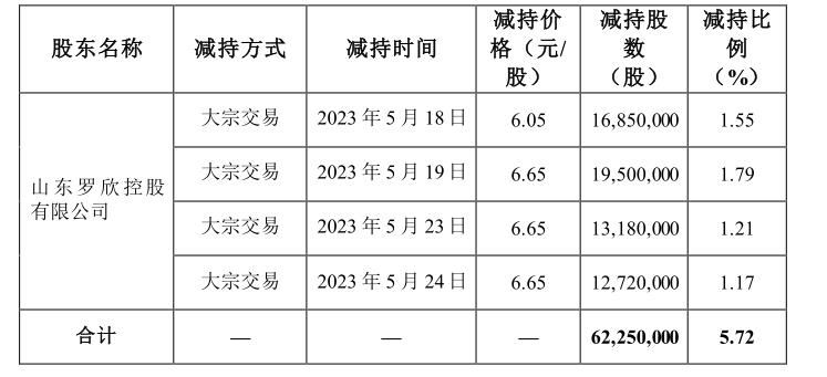 根据罗欣药业彼时披露的《简式权益变动报告书》,在上述期间,罗欣控股通过证券交易系统以大宗交易方式减持6225万股,共套现约4.04亿元。