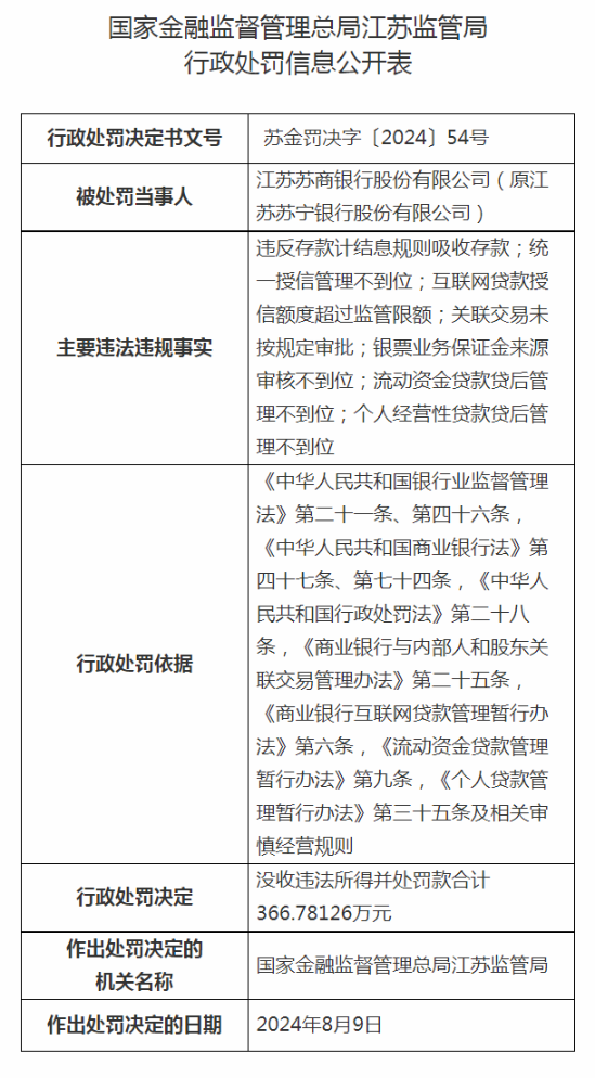 针对上述违法违规行为,国家金融监督管理总局江苏监管局依据《中华人民共和国银行业监督管理法》第二十一条、第四十六条,《中华人民共和国商业银行法》第四十七条、第七十四条,《中华人民共和国行政处罚法》第二十八条,《商业银行与内部人和股东关联交易管理办法》第二十五条,《商业银行互联网贷款管理暂行办法》第六条,《流动资金贷款管理暂行办法》第九条,《个人贷款管理暂行办法》第三十五条及相关审慎经营规则,对苏商银行没收违法所得并处罚款合计366.78126万元。作出行政处罚决定日期为2024年8月9日。