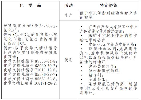 1.决定修正《关于持久性有机污染物的斯德哥尔摩公约》附件A第一部分,插入下列横栏,将短链氯化石蜡列入其中,并给予特定豁免: