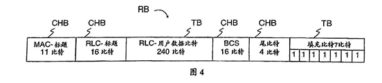 涉案专利说明书第11页第16行至第21行载明:“图4提供根据本发明当使用编码方法CS-2时该方法中的无线电数据块有效负载的内容的一个例子。有效负载包括连接到执行传送的校验比特CHB,在这些比特中传送MAC标题比特,RLC标题比特,BCS比特和尾部比特,并且传送用于用户数据传送的比特TB,在这些比特中,在这里传送RLC用户数据比特和在最后的七个填充比特……”。在图4(详见附图4)的实施例中,有效负载包含校验比特(CHB)和传送比特(TB),其中校验比特(CHB)包含“MAC-标题”、“RLC-标题”、“BCS”(数据块校验序列)和“尾比特”,传送比特(TB)包含“RLC-用户数据比特”和“填充比特”。