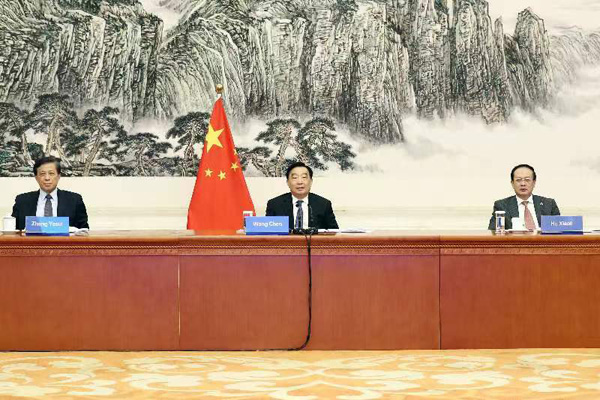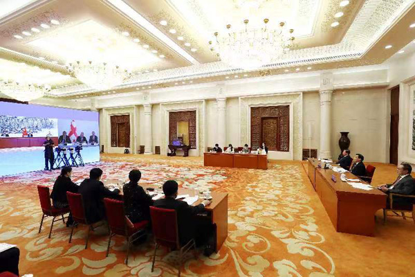 7月12日,中共中央政治局委员、全国人大常委会副委员长王晨在京与格鲁吉亚议会第一副议长乔治·沃尔斯基举行视频会晤。摄影/许麟