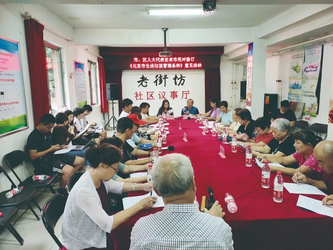 2019年8月28日,市、区人大代表在石景山区苹果园街道苹四社区,听取市民对《北京市生活垃圾管理条例(草案)》的意见建议。(北京市人大常委会供图)