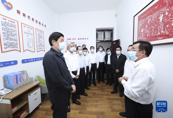 8月26日至28日,中共中央政治局常委、全国人大常委会委员长栗战书在甘肃就黄河保护法立法进行调研。这是8月26日,栗战书在庆阳市西峰区后官寨镇人大代表之家调研。新华社记者 庞兴雷 摄
