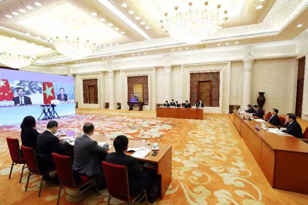 6月29日,中共中央政治局委员、全国人大常委会副委员长王晨在京与越共中央政治局委员、越南国会常务副主席陈青敏举行视频会晤。摄影/许麟