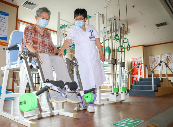 6月20日,在日照颐养公寓,医生指导老人通过训练椅进行锻炼。新华社记者 范长国 摄