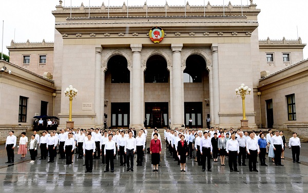7月1日,全国政协机关在全国政协礼堂(中共八大会址)前举行升国旗仪式,庆祝中国共产党成立101周年。全国政协副主席兼秘书长、机关党组书记李斌出席。全国政协副秘书长、机关党组副书记邹加怡主持仪式,驻会副秘书长、机关党组成员、专门委员会驻会副主任、有关部级领导以及机关党员代表参加。记者 田福良 摄
