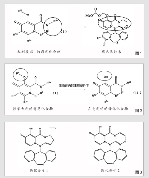涉案专利是在其在先发明的基础上进行的进一步研究,具体而言,是将在先发明中的化合物作为母体化合物,对其进行“前药化”,从而达到在向生物体施与后,所述前药化合物在体内被吸收而转化为母体化合物,从而发挥其帽依赖性核酸内切酶抑制活性的技术效果。(见图2)