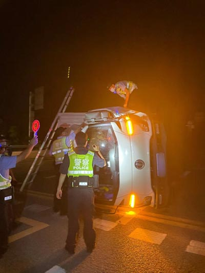 8月12日晚,博罗公安巡警大队按照县公安局开展“百日行动”破小案专项“东江3号”精准清查行动的部署,在罗阳治安卡点设卡盘查,23时许,一声巨响引起了在场队员的高度注意,循声望去发现收费站附近一辆货车侧翻在地。执勤民警欧一鸣立即带领辅警关文辉、黄连发、聂观胜、黄博、张远通上前查看,发现驾驶员被困在驾驶室无法脱身,欧一鸣组织辅警队员放置路障并取来扶梯,迅速开展救援,齐心合力最终将驾驶员安全救出。