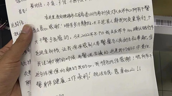 民主与法制网讯(□吴思敏 通讯员 陈瑰琦)在如今网络信息发达的时代,手写信已越发珍贵,笔者将感情寄托在纸上,一笔一划都具有温度。今年8月中旬,广东省珠海市香洲分局反诈中心成功为刘女士追回受骗资金人民币6万余元后,刘女士将其感激之情以手写信的方式送给香洲分局反诈中心。