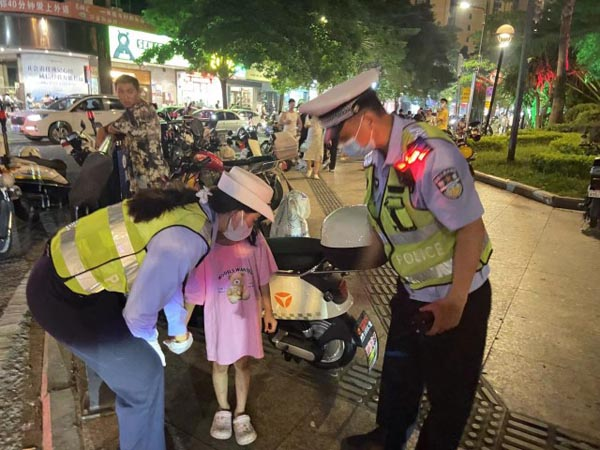 9月10日晚,根据工作部署,惠东警方在平山新广场路段开展排堵保畅工作。期间,群众发现一名约6岁的小女孩迷路,并将其送到警员身边。警员立即联系当地城西派出所,并在等待派出所的期间,一边安抚小女孩,一边询问小女孩家庭地址。