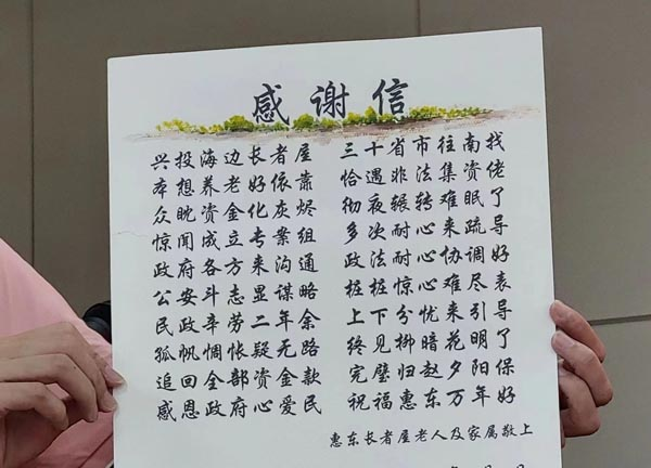 惠东县政府副县长、县公安局局长黄卓豪表示,惠东将持续推进打击整治养老诈骗专项行动工作,用好此次“长者屋”非法集资事件妥善处置的成功经验,建立常态化监管机制,加强预警监测和协同处置,守护好老百姓的养老钱,让老年人养老服务更加安全、安心。