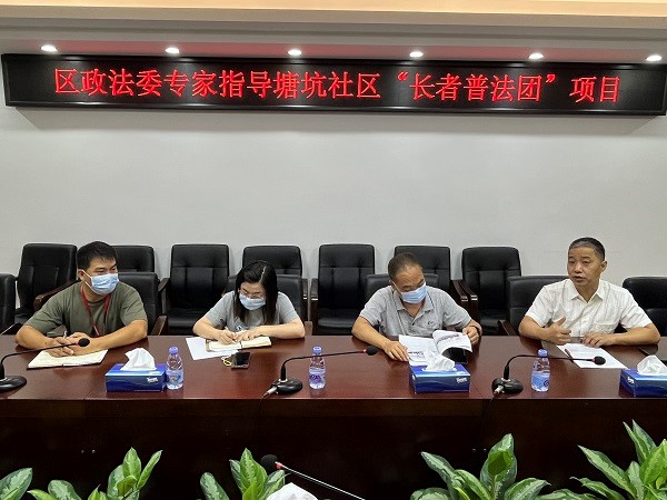 民主与法制网讯(□钟镜东 通讯员 黄锡龙)9月23日上午,深圳市龙岗区委政法委王月星、贺美欢,横岗街道陈小键组成的专家团来到龙岗区横岗街道塘坑社区听取“长者普法团”项目的阶段成果汇报。塘坑社区党委副书记肖里周,纪委书记梅玲玲,社区调委会主任刘华武,广东穗江律师事务所主任傅立标,在社区工作站会议室详细汇报了“长者普法团”的项目由来、阶段性成果,并与对方展开了深入的交流。