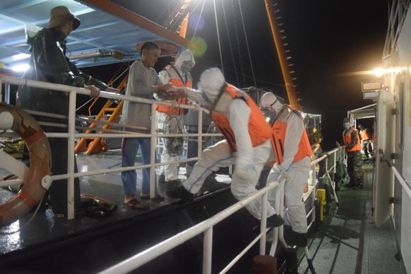 由于海上风浪较大,两船之间晃动碰撞剧烈,海警执法员多次尝试靠帮转运伤员均未能成功,该舰指挥员立即派遣随舰医师顶着风浪强行跳帮前往渔船,对伤员进行急救,防止因失血过多导致休克,威胁患者生命安全。护送该渔船返航途中,伤员一度出现意识模糊现象,随舰医师全程对伤员进行救助并安抚患者情绪。