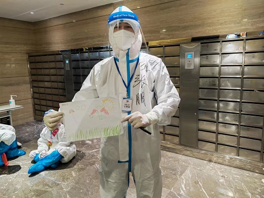 “在这期间,虽然每天工作任务繁重,但每每想到可以用实际行动一次次解决群众急难愁盼的事情,并得到他们的肯定和鼓励,心里总能泛起阵阵暖意。”张朋回忆道,有一次在社区封闭卡口搬运防疫物资时,遇到一名群众请求为封闭在家的亲属送去急用药品,张朋没有迟疑,妥善安排,将药品加急送到。二十分钟后,张朋的手机里收到了感谢短信。在一次上门核酸检测时,一位小女孩在母亲背后探出头说:“谢谢哥哥姐姐们,你们辛苦了!”并举起手中画,想要送给这些“大白”。