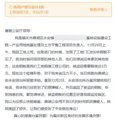 12月2日一早,民警将被盗钢板返还给工地,工地负责人竖起大拇指连番感谢,表示没想到不到3天时间就将嫌疑人抓获归案。他在“平安厅”信箱留下感谢信:“我以为没那么快破案,鼎湖公安用不到3天的时间抓获嫌疑人,给我挽回了损失,让我们感受到了平安就在身边!真心的感谢为办案民警!为肇庆新区良好的发展环境点赞!”
