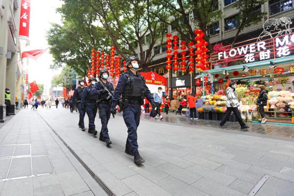 民主与法制网讯(记者 张丽娥 通讯员 公新文)为保障2023年春运、迎春花市和春节假期期间广州市社会治安大局稳定,围绕为广州高质量发展保驾护航的工作目标,市公安局认真落实市委、市政府和上级公安机关的工作要求,从1月19日传统花市开幕起,设立了“市、区两级+警种”的安保指挥部,全面启动等级勤务响应,全力以赴投入春节假期安全保卫工作。据统计,春节假期以来,广州警方每天投入社会面巡逻力量1.3万人次,累计发动4.6万个最小应急单元,强化市、区、街镇三级298个重点部位和人员密集场所的巡逻防控工作,有效筑牢社会面治安防控屏障。其间,广大民警、辅警坚守岗位,奋战一线,全力为市民群众过年创造良好的社会治安秩序,营造欢乐祥和的节日氛围。
