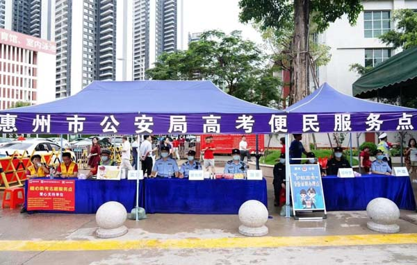 高考首日,惠州公安出动警力2546名、警车891辆次在全市各考点投入安保工作。严格落实“我为群众办实事惠警护航高考”10类30项服务举措,快速联动处置高考期间发生的各类突发事件和涉高考报警求助。按照“一考点一服务站一团队”的要求,各部门警种均提前在岗在位开展工作,交警部门专门安排 64支爱心护考队到各考点护航,累计救助群众15起。同时推送道路交通情况累计 85 条,增设考点(市区)周边临时指路标识累计54块,户政部门在考点设置“身份证明办理点”29个,累计为31名忘带身份证考生立即出具身份证明,110共接报涉考求助警情15起,均快速妥善处理。