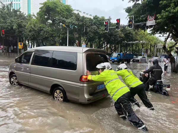 6月23日,暴雨来袭,东莞莞城街道多处路段积水较深,公安民警、辅警迅速响应,冒雨施救调困车辆人员,积极疏导交通秩序。通讯员供图