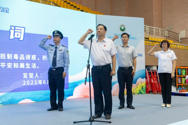 随后,优秀禁毒工作者代表上台带领全体人员进行宣誓,牢记历史使命,弘扬硝烟精神,共建禁毒示范城市。活动现场还颁发了“禁毒公益支持单位”、首批“无毒村居”创建单位等牌匾,并进行了高校禁毒公益联盟授旗仪式。