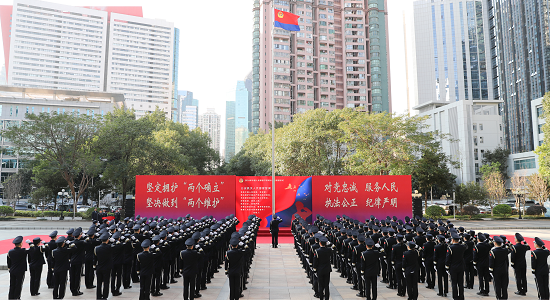 当日上午8时50分,在深圳市公安局大院,160名民警代表整齐列队、警容严整,9名仪仗队员迈着铿锵步伐,护卫着警旗正步走向升旗台。伴随着嘹亮的《中国人民警察警歌》,全体民警庄严敬礼,齐唱警歌,注视警旗冉冉升起。升旗完毕,全体民警面向警旗重温公安机关人民警察誓词,用坚定有力的誓言表达深圳公安全面贯彻落实党的二十大精神、矢志不渝做党和人民的忠诚卫士、维护国家安全和社会稳定、坚决完成好党和人民赋予的使命任务的信心和决心。