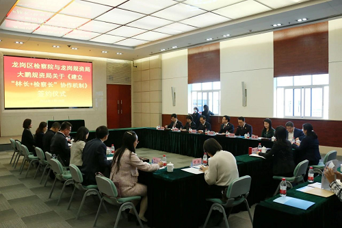 民主与法制网讯(记者 池泽梅 通讯员 张琼文)青峦叠翠渺无际,碧水周流天地间。海风轻拂冬日的鹏城,小寒已至,龙岗区检察院会议室里却暖意融融。1月10日下午,龙岗区检察院联合深圳市规划和自然资源局龙岗管理局(以下简称“龙岗规资局”)、深圳市规划和自然资源局大鹏管理局(以下简称“大鹏规资局”)举行《关于建立“林长+检察长”协作机制的意见》签约仪式,8名区人大代表、政协委员受邀到场见证签约仪式。龙岗区检察院党组书记、检察长候选人李荣斌,龙岗规资局局长周庆华,大鹏规资局局长李志辉,院党组成员、副检察长黄锐意及相关部门负责人参加活动。