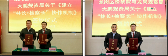签约仪式上,龙岗区检察院党组书记、检察长候选人李荣斌与龙岗规资局局长周庆华、大鹏规资局局长李志辉分别签署了《关于建立“林长+检察长”协作机制的意见》。