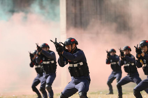 “格斗式准备!”十余名英姿飒爽的特警队员出现在操场上,开始格斗展示,动作干净利落。“哇!好厉害!好酷啊!”接踵而至的警犬扑咬科目、索降攀爬科目引起观众们的连连欢呼。“飞绳走壁、侧身下滑、倒立破窗突入”等高难度技术动作更是让大家直呼过瘾,完美地展现了惠阳公安这支铁军队伍的专业素养和精气神。