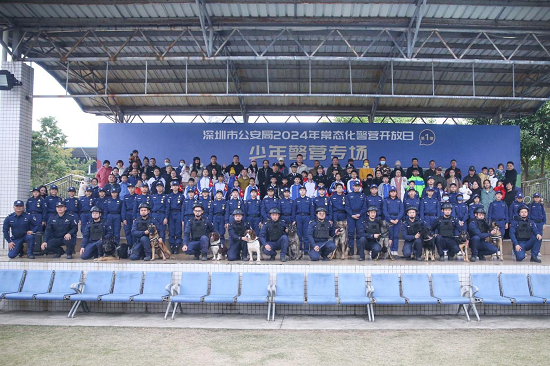 这是深圳公安“警营汪汪队”主题开放日活动的现场,来自盐田、宝安、龙岗少年警营的120名少警队员及家长参加活动,他们在与警犬零距离、面对面的互动中感受、体验和了解公安刑侦和警犬工作。