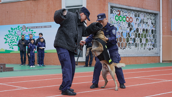 在“搜爆排爆”科目展示中,搜爆警犬从四名人员携带的物品中锁定一个可能藏有违禁品的行李箱,“歹徒”随即拿出刀具“行凶”,随着训导员一声令下,警犬便迅猛地扑向“歹徒”,死死咬住“歹徒”手臂不放手。孩子们被警犬迅猛的动作与无畏的精神所震撼,纷纷拍手叫好。控制“歹徒”后,现场警力从行李箱中又发现疑似爆炸物,全副武装的排爆队员果然在搜爆犬引导下找到“爆炸物”,并操作排爆机器人将爆炸物转移至防爆桶销毁。在之后的警犬技能展示环节,训导员展示了警犬协同作战、警犬钻火圈等精彩科目,孩子们在精彩的警务技能展示科目中增强安全意识,种下“正义”“勇敢”“无畏”的种子。