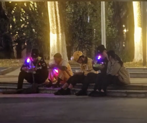 当晚,东莞一外卖小哥在送完最后一单后,来到马路边上坐下,匆匆吃起晚饭,坐在旁边的还有一名正在休息的环卫工人。此时,一名东莞警员收到家属送来的饭菜,也坐在路边准备吃饭。这名警员注意到了旁边正在吃饭的外卖小哥,主动走上前去寒暄,并将自己的饭菜分享给了外卖小哥。