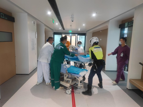 到达医院后,铁骑还积极配合家属、医护人员将病人送进急诊室,看着医护人员对病人展开救治后,才返回到工作岗位继续执勤。