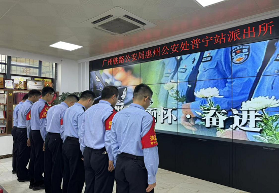普宁站派出所全体在家民警整齐列队,为英雄先烈默哀,表达对他们无限的哀思和崇高敬意。随后,民警们一起观看了英雄事迹短片。回顾铁路公安的历史,在国家建设和社会发展的各个时期都活跃着英雄们的身影,如为了打击货盗犯罪分子重伤牺牲的易苏阳;为保护配枪勇斗持枪犯罪分子而英勇牺牲的赵宏伟;为排除险情被列车撞倒牺牲的雷宏等等。他们舍生忘死奋战在打击违法犯罪的最前沿,用自己的生命践行着对人民群众的庄严承诺。