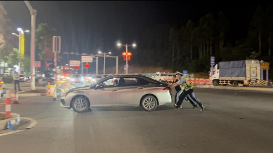 5月6日凌晨2时30分,博罗县公安局交警大队泰美中队民警王进伟带领辅警许思年、曾嘉业巡逻至泰美镇政府大道红绿灯路段时,发现前方道路上停了一辆银色轿车正打着双闪。王进伟见状,立即靠边停车,做好安全防护措施后,上前询问情况。