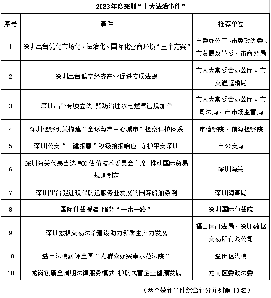 2023年度深圳“十大法治事件”涵盖立法、执法、司法、法治政府、法治社会、涉外法治建设等方面,其中不乏全国首创、首例,这些典型、创新、先进的法治实践,是深圳法治建设与时俱进的有力诠释,彰显了法治在维护人民群众切身利益、服务保障高质量发展和高水平对外开放的重要作用。