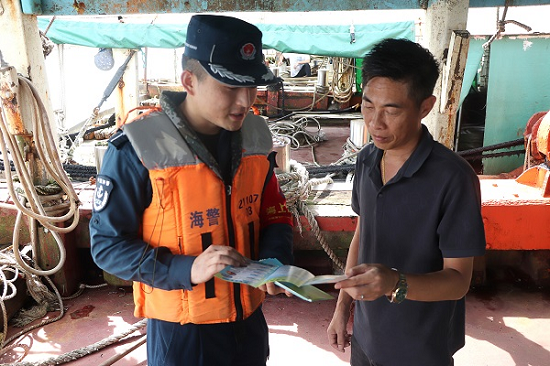 大鹏海警执法员为渔船民宣讲安全知识。通讯员供图