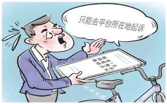 近日,消费者权益保护法专家陈音江向《法治日报》记者反映:一些网络应用平台通过协议的方式,明确用户与平台发生纠纷时,只能去平台所在地法院起诉。“比如,《××单车信息服务协议》约定:因本协议发生争议,可以协商解决,协商不成,可通过本协议签订地即上海市××区有管辖权的人民法院解决争议。”