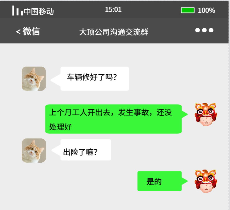 大顶公司(化名)是车辆出租公司,常年将公司车辆批量交给文风(化名)汽修厂维修。双方有固定的微信群,平时都在群里实时沟通车辆维修进展。