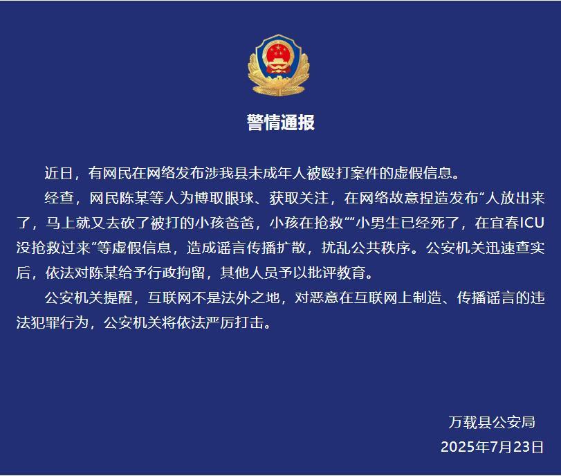 7月23日下午,万载县公安局发布警情通报称,网民陈某等人为博取眼球、获取关注,在网络故意捏造发布“小男生已经死了,在宜春ICU没抢救过来”等虚假信息,公安机关依法对陈某给予行政拘留,其他人员予以批评教育。