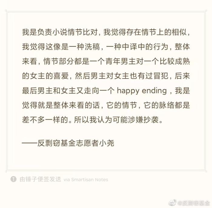 28日晚,反剽窃基金通过其微博公开了部分志愿者对《越过时间拥抱你》《小南风》两部作品阅读比对的反馈。