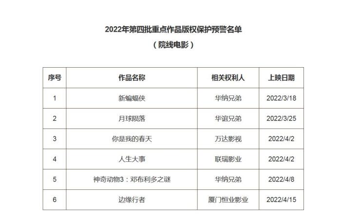 中新网3月15日电 据国家版权局网站消息,按照国家版权局《关于进一步做好院线电影版权保护工作的通知》及版权重点监管工作计划,根据相关权利人上报的作品授权情况,现公布2022年度第四批重点作品版权保护预警名单。