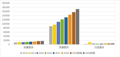 据最高人民法院数据显示,2013年—2015年,全国新收知识产权一审案件从10万件增长到12.34万件,预测2020年,将上升到19.3万件,增长率9.29%。其中,知识产权民事案件大幅增长。
